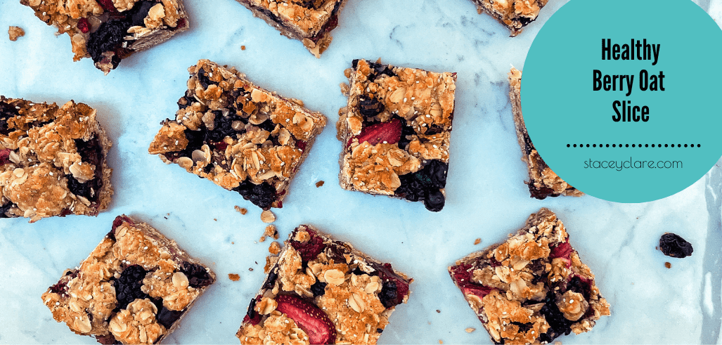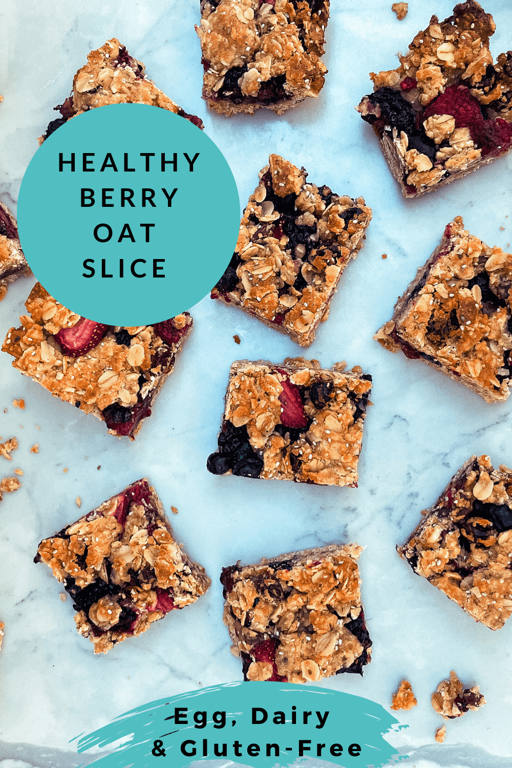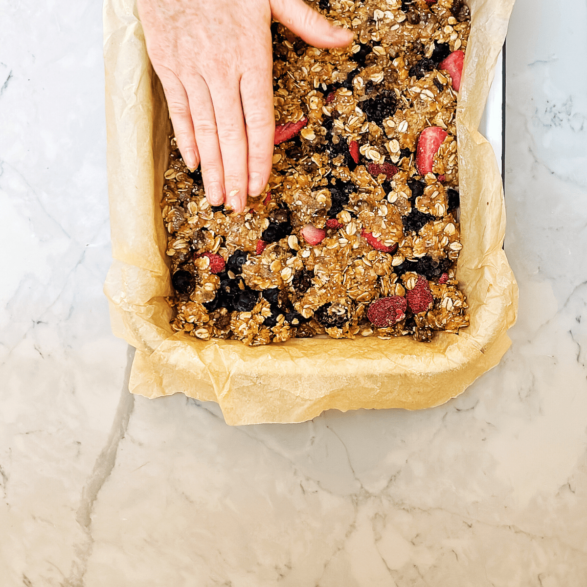 - Push ¾ of the mixture into the lined tray, ensuring no holes are left by pressing down very firmly. Arrange the frozen berries over the mixture and sprinkle with the vanilla bean powder. Finish by sprinkling the remaining ¼ of oat mixture on top and bake for 35 minutes or until golden. Allow to cool in the pan before slicing.