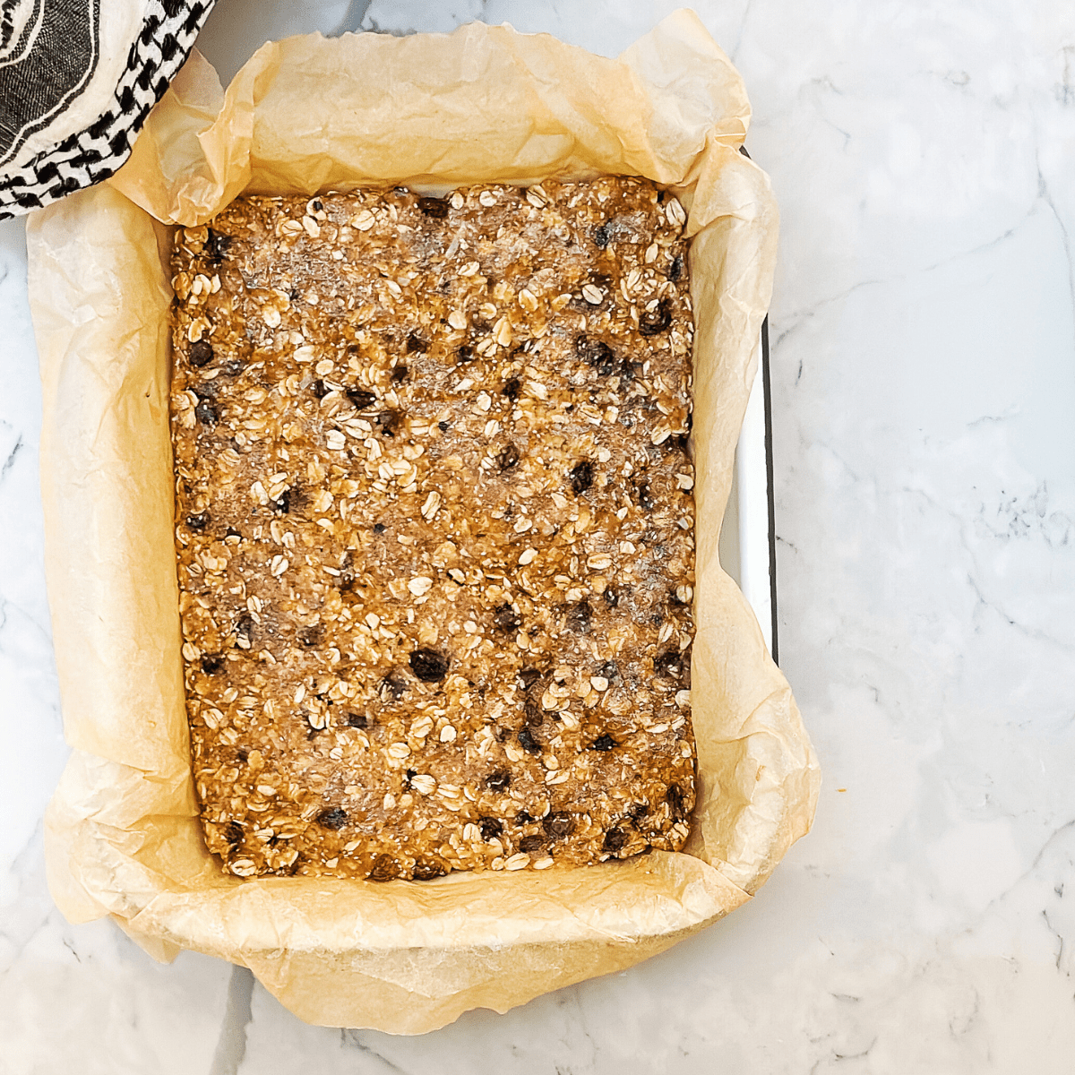 - Line a 25cm x 18cm oven tray with baking paper and pre-heat your oven to 200°C. Melt the butter in a saucepan whilst combining all the dry ingredients in a large bowl.