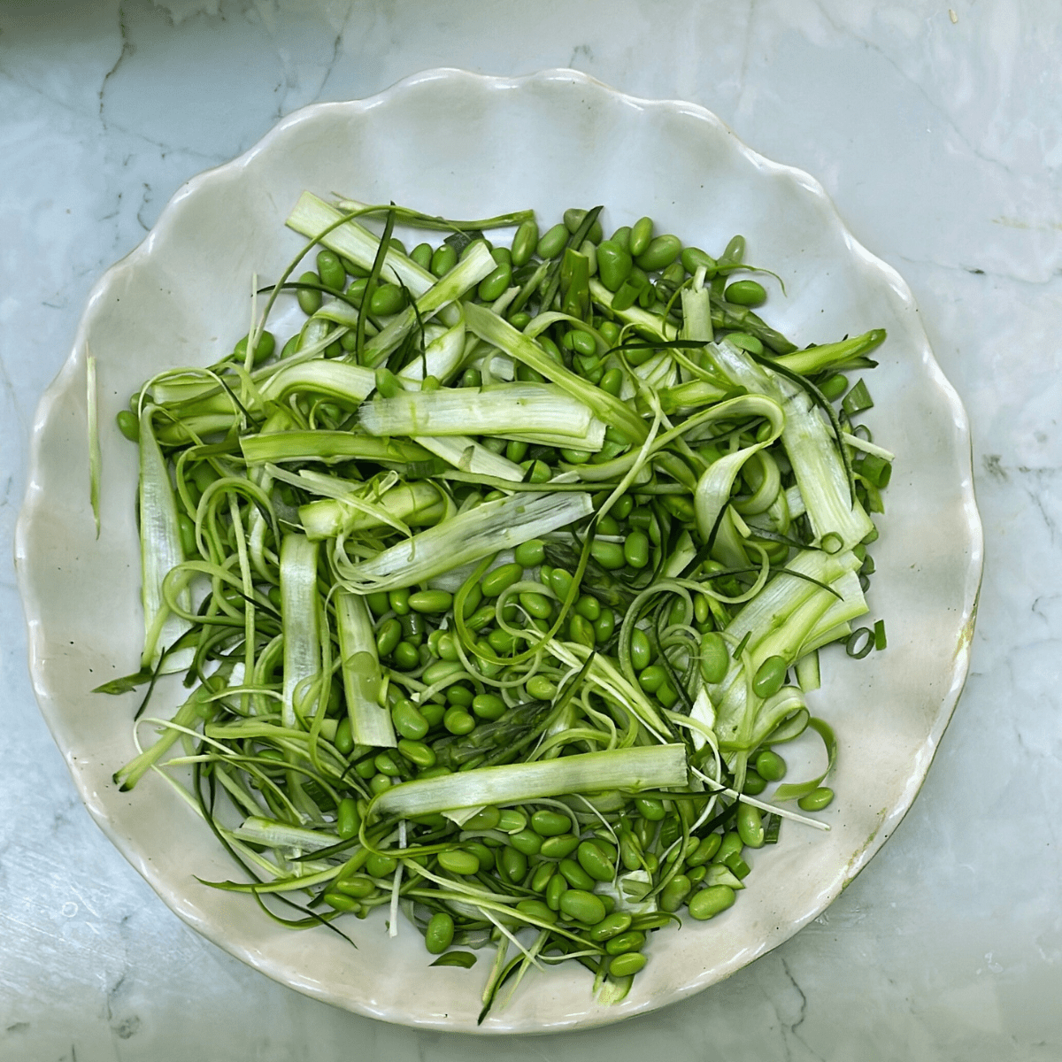 - To pull the salad together, steam the edamame beans and use a peeler to peel the asparagus into ribbons, lengthways. Use the same or a julienne peeler, and peel the cucumbers down to the seeds.
