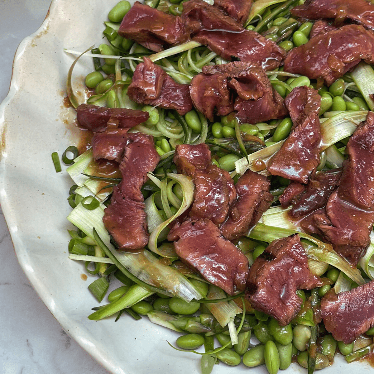 - To assemble the salad, pop the edamame beans along with the asparagus and cucumber ribbons on the bottom of the bowl. Top with the thinly sliced steak and drizzle the resting juices over the salad before topping with the dressing you made. Toss and top with the sesame seeds.