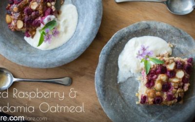 - Place the oats in a greased or lined tray or small casserole dish. In a blender, food processor or large jug mix the milk, eggs, sweetener, vanilla powder and melted butter well. Pour over the oats and top with the raspberries and macadamia nuts.