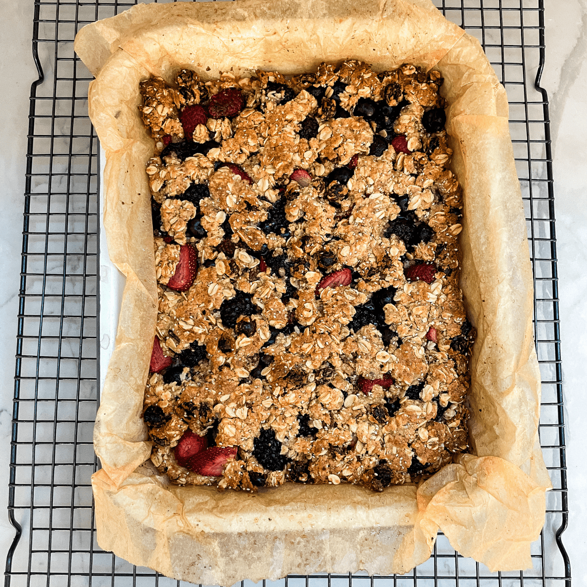 - Push ¾ of the mixture into the lined tray, ensuring no holes are left by pressing down very firmly. Arrange the frozen berries over the mixture and sprinkle with the vanilla bean powder. Finish by sprinkling the remaining ¼ of oat mixture on top and bake for 35 minutes or until golden. Allow to cool in the pan before slicing.