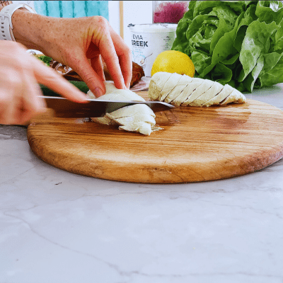 The best part? If I’ve got a kilo of this juicy poached chicken in the fridge, I can turn it into just about anything. The babes have it in their lunchboxes — on sandwiches or stirred through pasta. I’ll toss it into a hearty salad for lunch, like these Tzatziki Bowls and for dinner, I’ve lost count of how many times I’ve whacked it on top of my sourdough pizza bases (that I make in bulk!) and straight into the oven.