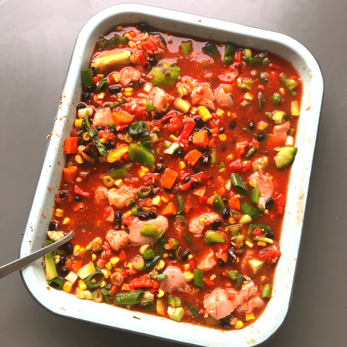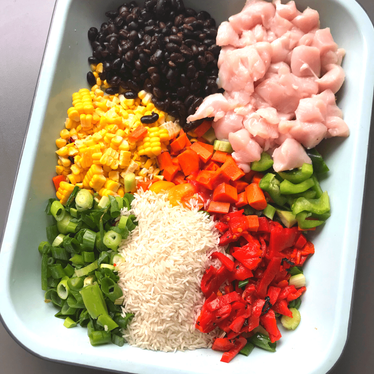 And best of all, you can make this yummy one-pan mexican meal into a freezer dump bag. It’s so simple. Dump everything into a ziplock bag and freeze. When you’re ready to cook. defrost and pour out into a tray and cook. It is the ultimate meal prep hack.
