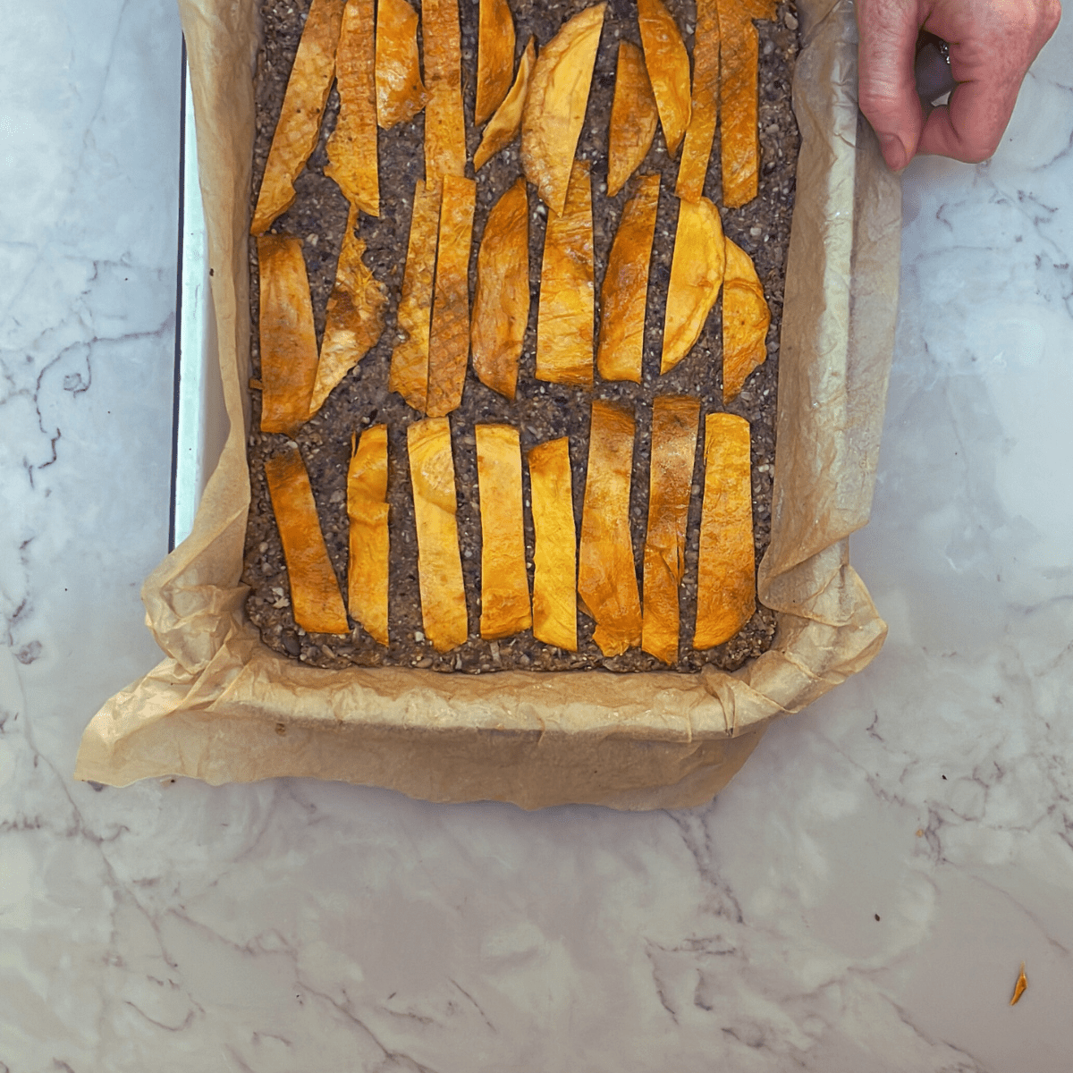 Pour the toasted mixture into a blender and pulse for a few seconds until it’s roughly chopped. Then combine the wet and dry mixtures in a bowl. Press the mixture into the lined pan, ensuring there are no holes. Slice the mangos and scatter them on top, pressing down gently.