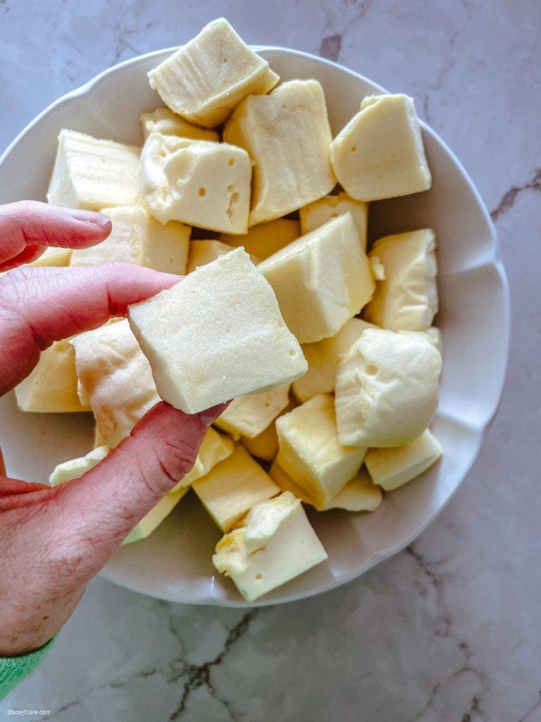 5. Chop the marshmallows using a bread knife or kitchen scissors. They’ll store for weeks in the fridge or are REALLY fun eating them straight from the freezer.