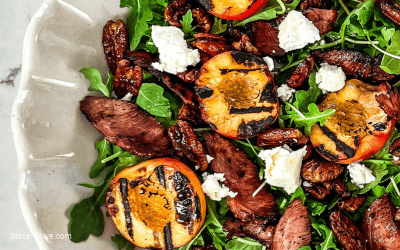Peaches are in season, and boy are the delicious in this easy Peach and Balsamic Pecans Salad. Just turn the BBQ on and cook the peaches and bacon at the same time. They'll be done when the rest of the salad is ready to go too! SO QUICK!