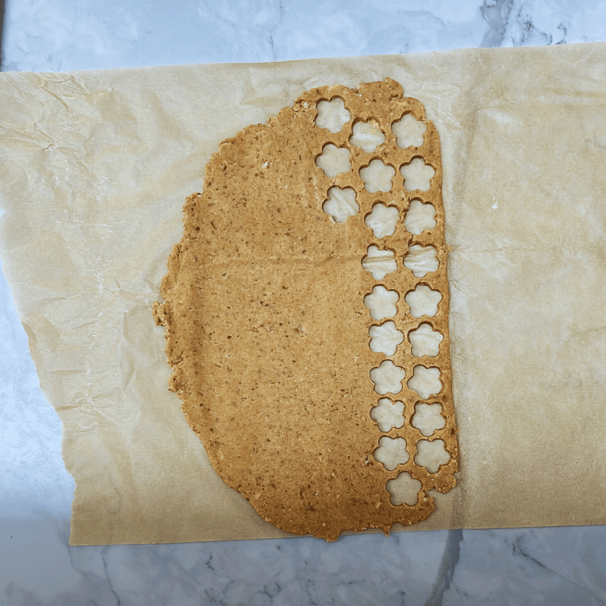 Add the remaining ingredients and pulse until the dough comes together in a ball. Roll out the dough into 1/2cm thickness and pop in the freezer to harden for 20 minutes.