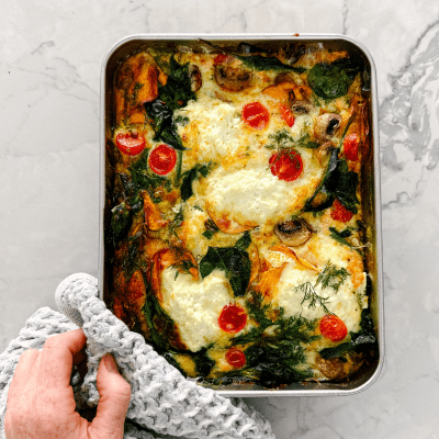 If we’re a little the same, a high-protein breakfast is always on the list — but time isn’t. My take on a frittata using salmon and dill, with egg whites, is such a winner. You can whip one up in 15 minutes, handball it into the oven, and brekkie’s sorted for the week. You can eat it cold, or I whacked mine in the air fryer for 10 minutes and it was perfect.