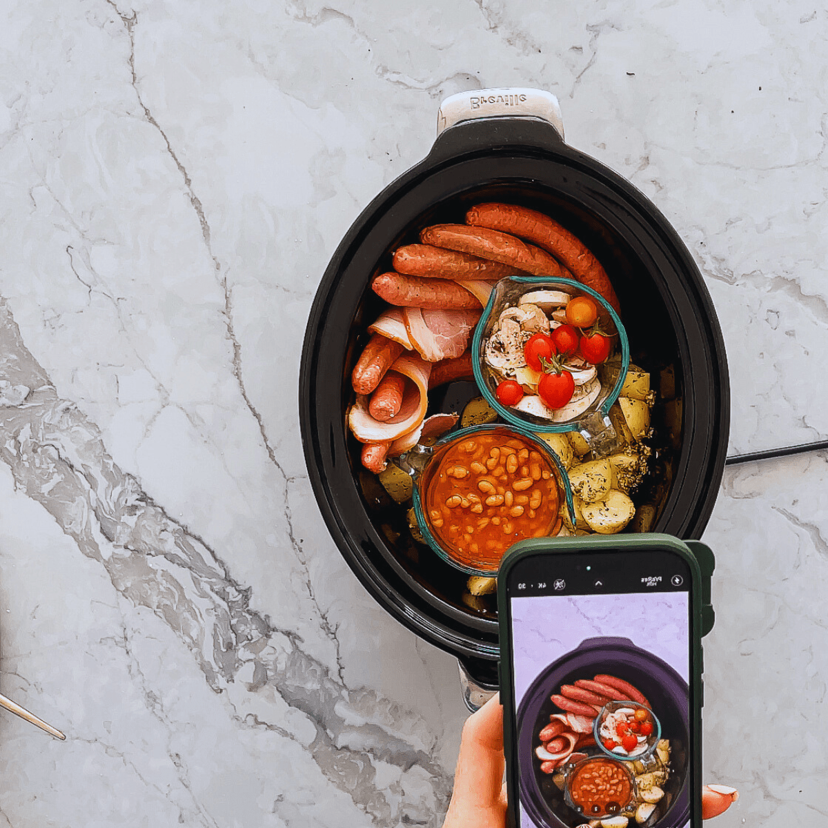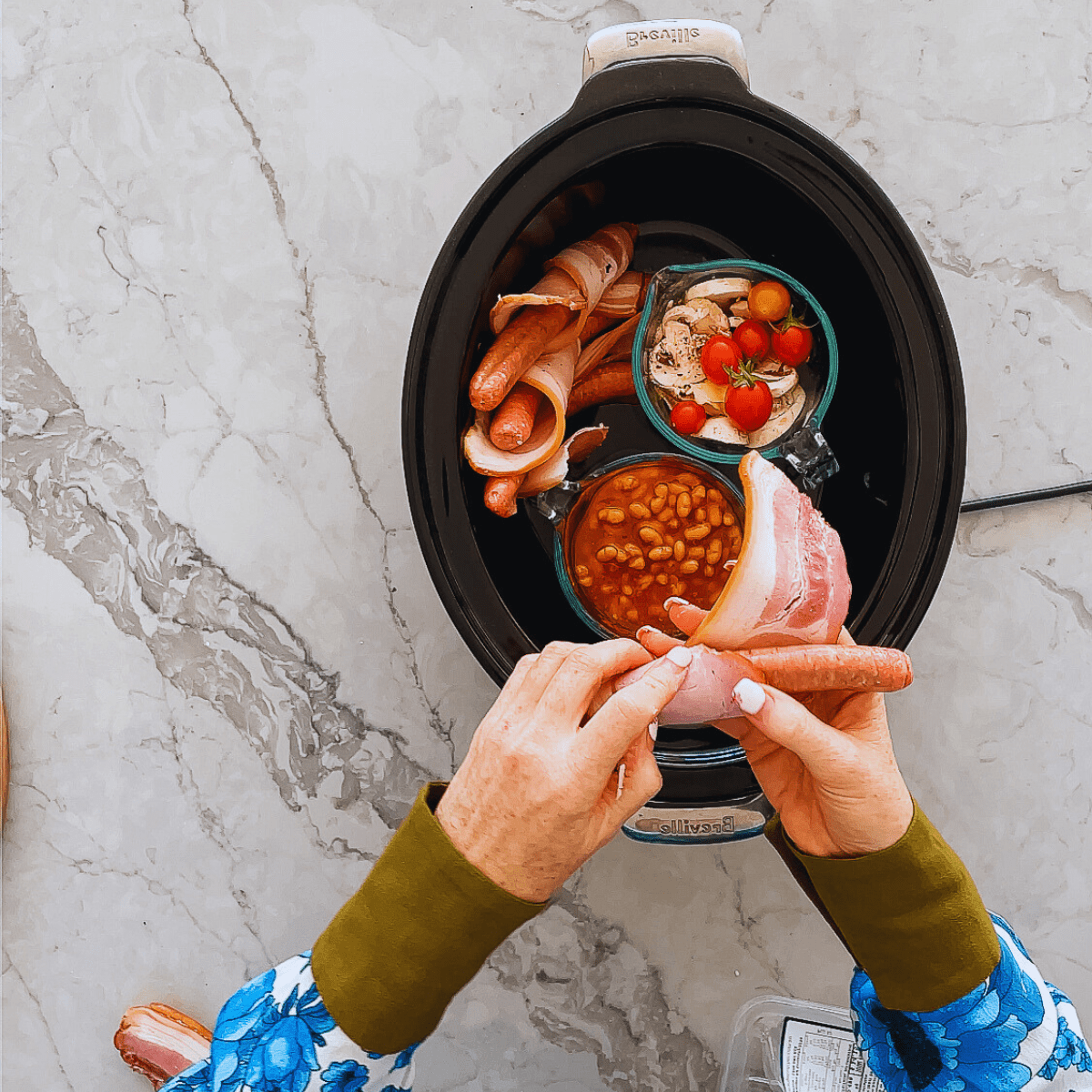 Pop your sausages, bacon and hash browns around the edges of the slow cooker. And then put the mugs inside. Lid on and cook for 6-hours on low.