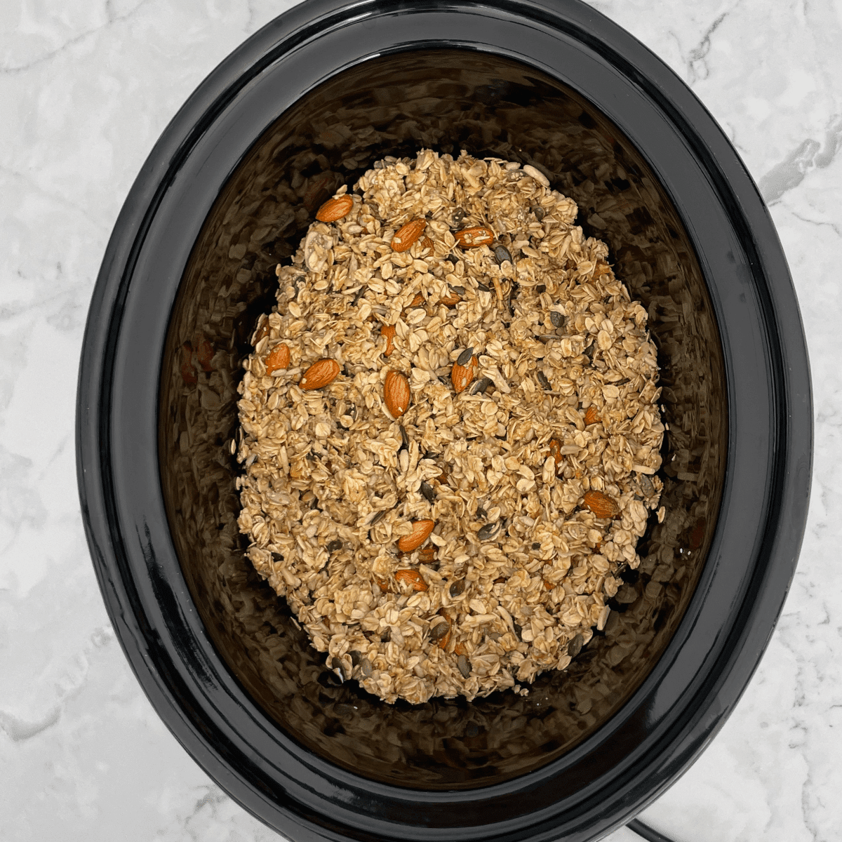 STEP 3: Turn it high for 2 hours and pop a tea towel under the lid to catch any condensation. Stir it every 30-mins or so if you are home. If your lid is a very tight pressure cooker, leave it off and cook it longer; otherwise, the muesli will not crisp up.