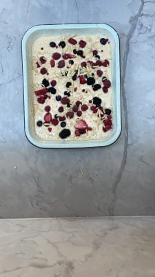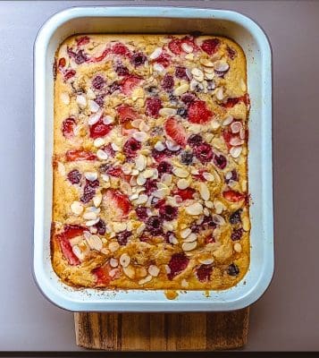 3. Sprinkle the berries over the top. No need to push the berries in, they pancake will rise enough during cooking to keep them down. Then sprinkle the almonds over the top (not essential) and then the sugar and the butter. Have a watch of the video to see how I do that. Bake in the oven for 45-mins and check it’s cooked when the middle is set when you touch it. You can also use the toothpick method to check it comes out clean.